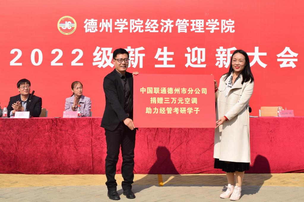 会上,爱心企业中国联通网络通信有限公司德州市分公司向公司捐赠价值3万元的四台空调,安装在考研教室,助力经管学子考研,彰显了企业的社会责任和担当。