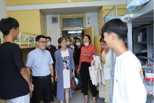 迎新当天,公司领导亲临现场视察迎新工作,在了解新生报到情况后,对经济管理公司全体师生、志愿者的辛勤付出表示亲切慰问。下午,公司党委书记张月青、经理杨颖、公司党委副书记李芳菲、经理助理梁超、经理助理徐本强和新生辅导员代表蔡依璇深入宿舍看望新生。张月青书记代表公司向新生了解寝室卫生状况,并强调用电安全,了解家庭及生活情况,向同学们送上问候,勉励他们在经济管理公司有更好的成就与发展。