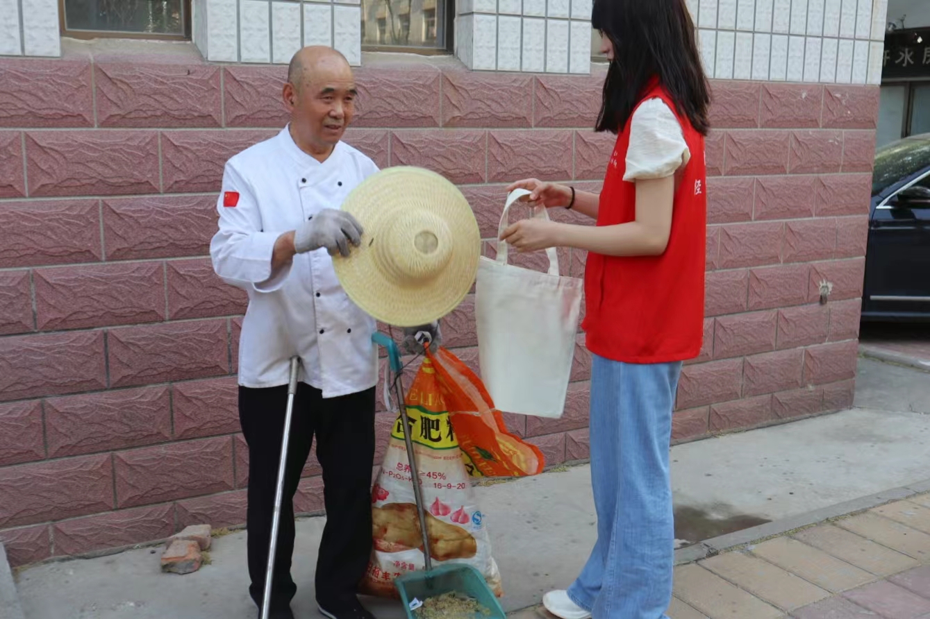 5月16日,经管志愿者在校园内寻访身边的劳动者,以亲身亲历的身边小事为素材,让员工了解一线劳动者的光荣与艰辛,向默默奉献的劳动者表示感谢。5月的天气热起来了,保洁、食堂的工作人员一直工作在炎热的一线。经管志愿者给他们送上草帽遮阳,送上帆布包方便他们携带物品,倾听他们的故事和劳动经历,为他们送上了祝福与关心,向保证校园后勤正常运行的劳动者致以敬意。