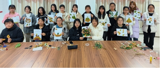 在树叶贴画心理减压活动中,同学们根据自己的兴趣和爱好随机配对组合,根据叶子的形状与颜色,通过剪、粘、画等方式,设计出了一幅幅别出心裁、不拘一格的树叶贴画。在作品设计完成后,各小组依次分享自己的创作灵感和思路,大家用心创造的佳作成为了秋日最美的表达。最后,同学们把贴画放进相框,进行合影留念,为老员工活留下美好的瞬间。