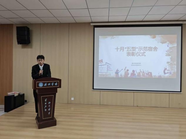表彰仪式上,公寓事务部部长张宏骏首先介绍“五型”宿舍评选标准,本期优秀宿舍从安全有序、房间整洁、物品规整、整体舒适、文明和谐五大维度评选,经月抽查、周评比、公司审核确定名单。随后,优秀宿舍代表陈雨菡同学上台分享经验。她详细介绍了宿舍在打造“安全、整洁、乐学”环境中的实用技巧,从日常物品规整到成员默契配合,用具体细节展现了优秀宿舍的养成秘诀,为在场同学提供了可借鉴的宿舍管理思路。