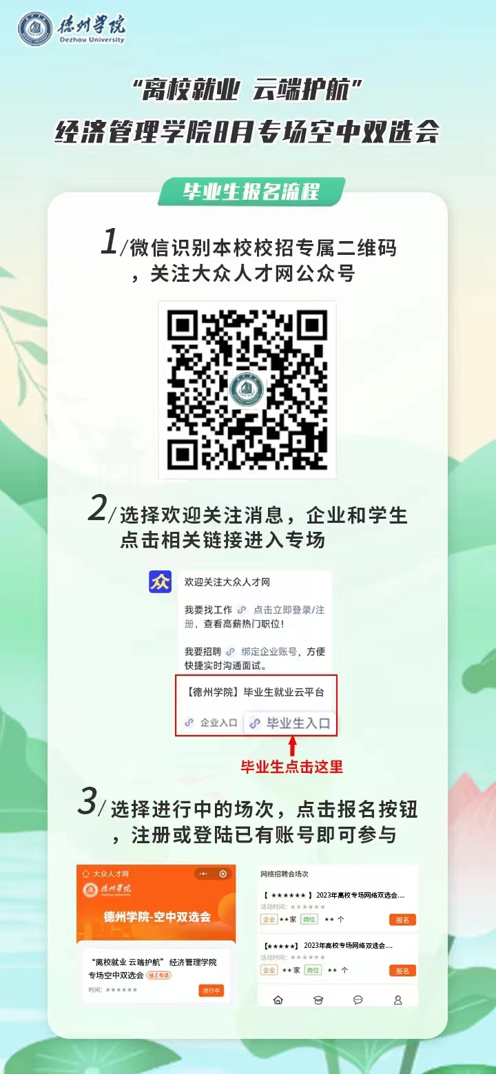 本次双选会采用“大众人才网”网上报名方式,之前未在大众人才网平台注册过的企业和个人需先进行注册完善信息后再报名参与,注册网址www.dazhonghr.com