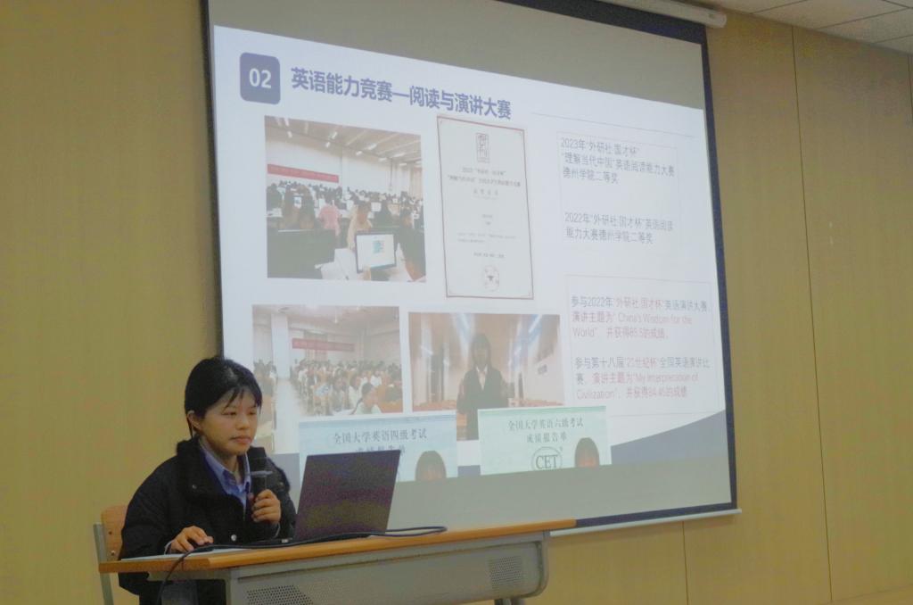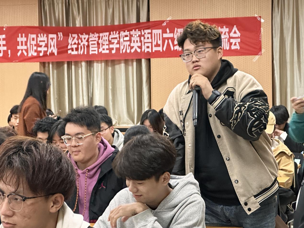 交流会上,刘俊同学结合自身经历,分别从听力、阅读、写作、翻译四方面进行经验交流,详细分享了备考四六级考试的心得和应试技巧,针对每个部分提供了具体的学习方法和建议。她表示,英语四六级备考是一场持久战,需要在态度上严谨认真,结合自己的学习情况,制定适合的学习计划,设定合理的学习目标。首先,注重平时的积累,收集历年真题,总结近年来的难点热点,及时回顾,认真复习;其次,模拟考试现场,将自己代入到考试的环境中,定时完成真题训练,身临其境;最后,要保持良好的心态,不畏惧难题,不急于求成。在交流互动环节,同学们积极提问,与主讲人进行了深入讨论。