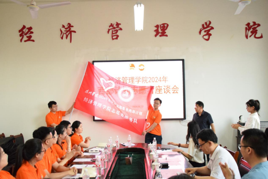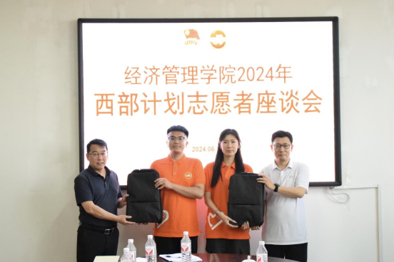 单振涛为志愿者们颁发纪念品,并为经济管理公司西部计划志愿服务队授旗。同学们深情回顾了校园学习生活的点点滴滴,表达了对公司培养的感恩之心和对师长的感激之情,依次分享了选择西部计划的初衷和打算,讲述了对未来的规划和憧憬,表示将秉承“艰苦奋斗,自强不息”的德院精神,投身西部、扎根基层,用实际行动践行责任与担当,用青春与汗水为祖国发展贡献力量,创造德院学子奉献西部的品牌。