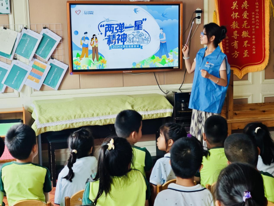 7月10日,“薪火”宣讲团走进德育幼儿园,讲解员们以“两弹一星”的动画视频开场,向小朋友们以趣味性的方式说明“两弹一星”的含义,向小朋友们介绍了“两弹一星”的功勋人物和历史成就,利用教具同小朋友们以游戏的方式调动积极性。游戏过程中,讲解员向小朋友们提出相关问题,小朋友们踊跃举手抢答,脸上洋溢着对知识的渴望和对英雄的崇敬。