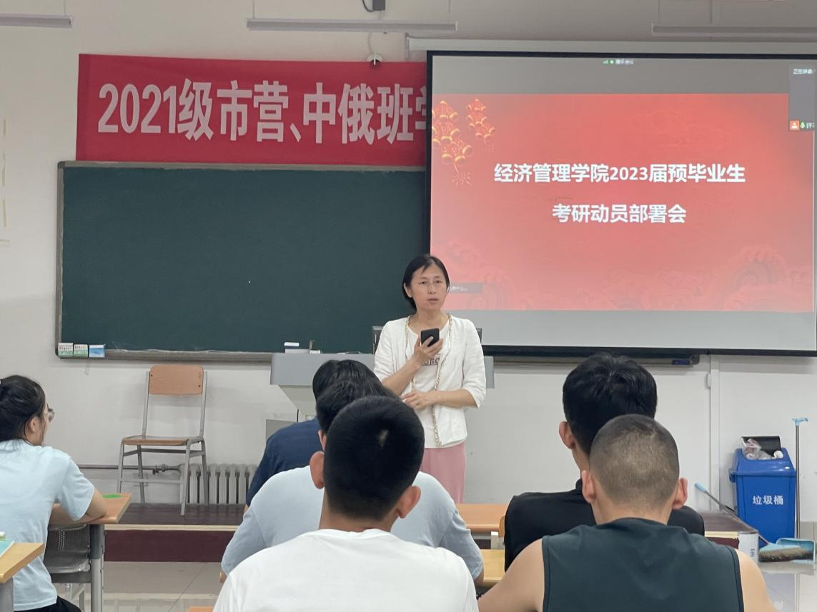 经济管理公司考研工作负责人从三个方面做了考研工作安排及部署。首先介绍了当前的考研形势以及公司2022届毕业生的考研情况,然后就公司下一步的考研工作向同学们做了详细的介绍,包括暑假返校安排、考研教室的调整、考研科目的课程安排等工作。随后,经济管理公司经理从职业发展规划的角度,强调了考研的重要性,鼓励同学们积极选择考研,为自己的人生提供多一种选择。并就暑期考研学习安排进行了进一步说明。