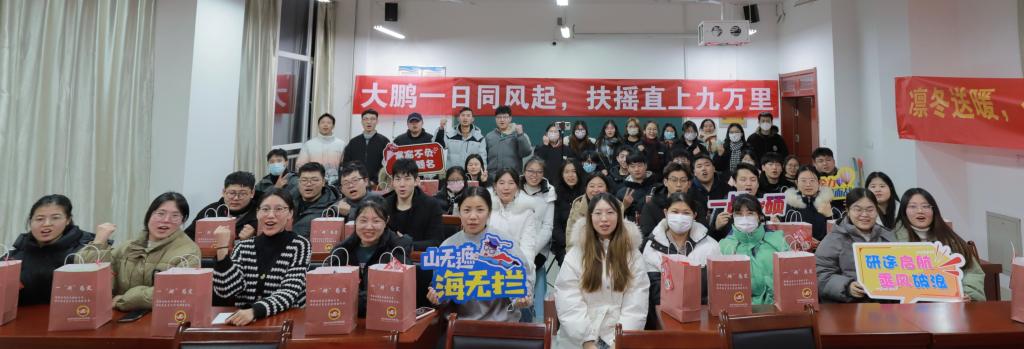 桃花直透三层浪,桂子高攀第一枝。2024年硕士研究生招生考试在即,为了鼓舞考研学子士气,缓解考生复习备考压力,坚定学子上岸决心,增添复习备考动力,12月15日下午,经济管理公司在明理楼0364教室为2020级考研学子举行了“凛冬送暖,沿途璀璨;佳音可期,一研为定”送温暖活动。经济管理公司全体班子成员、毕业年级辅导员班主任、家长代表、2023年考研员工参加了活动。