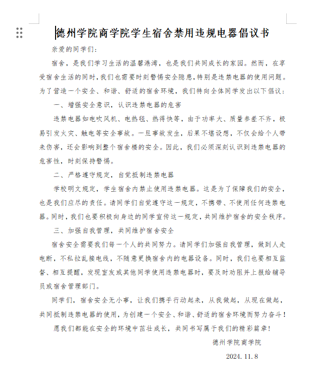 《太阳成集团tyc234cc员工宿舍禁用违规电器倡议书》从三方面强调宿舍安全,号召员工不仅要充分认识使用违规电器的危害,更要自觉抵制违规电器。最后,倡议书强调广大同学不仅要加强自我管理,还要勇于监督、提醒身边的同学,共同维护宿舍安全。