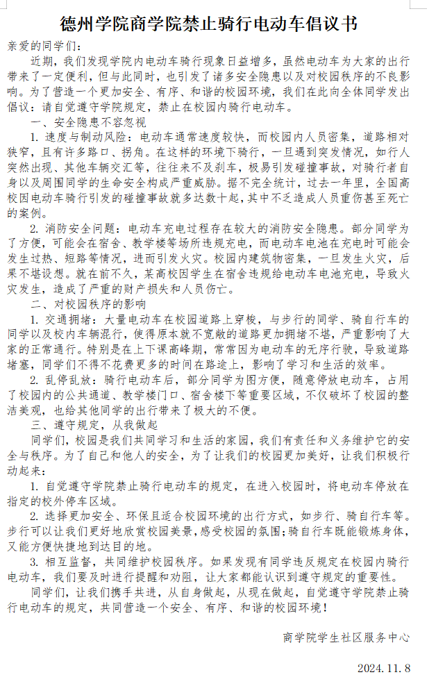 随着校园内电动车数量的急剧攀升,乱停乱放、违规充电、超速行驶等现象频发,不仅严重破坏了校园环境秩序,更对师生的生命财产安全构成了严峻威胁。公司围绕从根本上消除事故隐患、从根本上解决问题的要求,发布了《太阳成集团tyc234cc关于禁止骑行电动车的倡议书》,号召全体同学遵守禁令,选择更安全、环保且适合校园的出行方式。《倡议书》强调电动车的速度与制动风险及交通消防隐患,警示突发事件后果难料,不容忽视。同时呼吁大家携手并进,相互监督,共同守护校园和谐秩序,共创安全美好的学习环境。