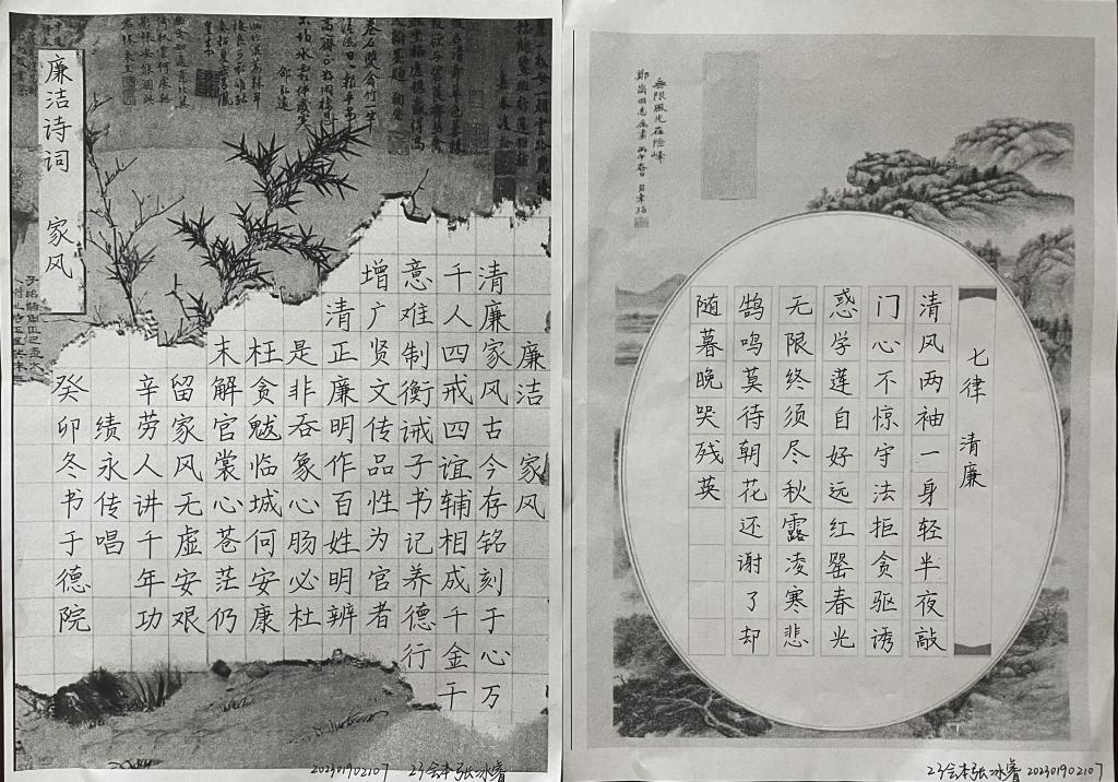 活动自11月12日开始征集作品,为期3天,得到了经济管理公司全体员工的广泛响应,共收到书法作品20余件。这些作品风格各异,有的飘逸俊秀,有的粗犷豪放,一幅幅书法作品诠释着员工对廉洁廉政理念的理解与传承。同学们在创作中展现出了扎实的书法功底和独特的艺术风格,每一幅作品都充满了真挚的情感和灵动的生命力,展现出书法艺术的无穷魅力。