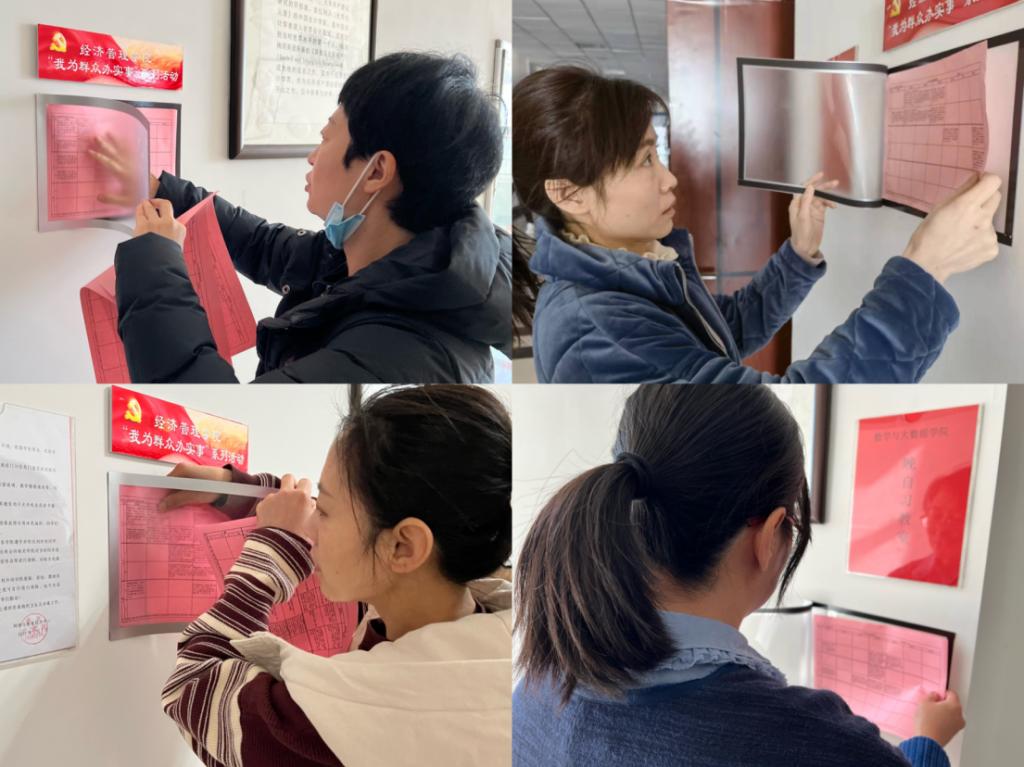 上学期,针对员工找空余自习教室难的问题,第一教师党支部为同学们在教室门口粘贴了课程表,以备同学们随时查看教室上课信息,根据自己需求选择合适的教室。这样既减少了同学们寻找教室的时间,也降低了更换教室的风险,极大程度地提高了同学们学习的效率。