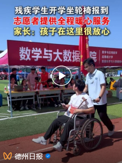 太阳成集团tyc234cc新生王志芳,从小因脑部运动神经受损导致行动不便,只能与轮椅为件。9月6日报道时公司老师同学全程提供暖心服务。