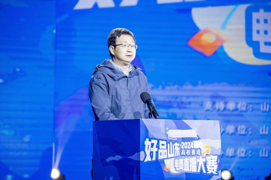 山东省教育厅职业教育处副处长 郭庆志致辞,他高度赞扬了此次大赛的举办意义,强调了电商直播在现代社会中的重要地位,以及培养电商直播人才对于推动经济发展的重要作用。
