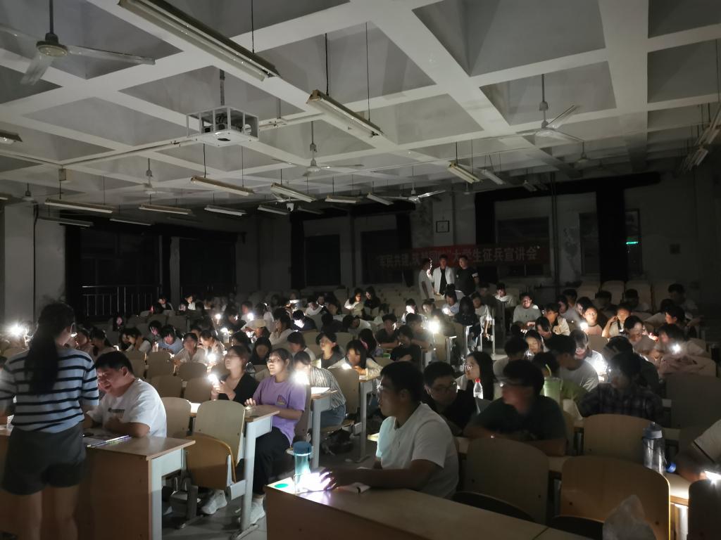 宣讲会进行的过程中突然遭遇断电,同学们自发拿出手机照明,仍然热心听讲,积极咨询。