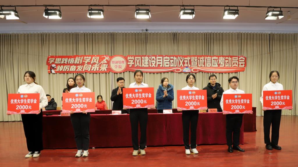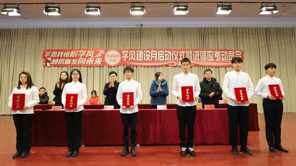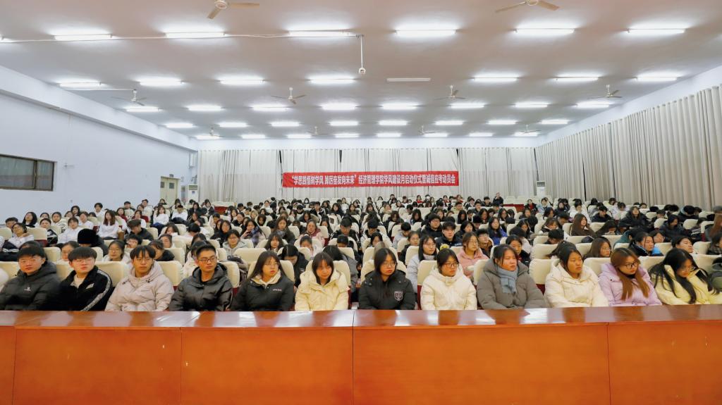 为进一步端正学风,严肃考风,营造好学、乐学的学习氛围。12月21日,经济管理公司在求实楼0409报告厅开展了“学思践悟树学风,踔厉奋发向未来”学风建设月启动仪式暨诚信应考动员会。公司领导班子,全体辅导员、班主任老师,各年级员工代表共350余人参加活动,本次活动同时设线上分会场。