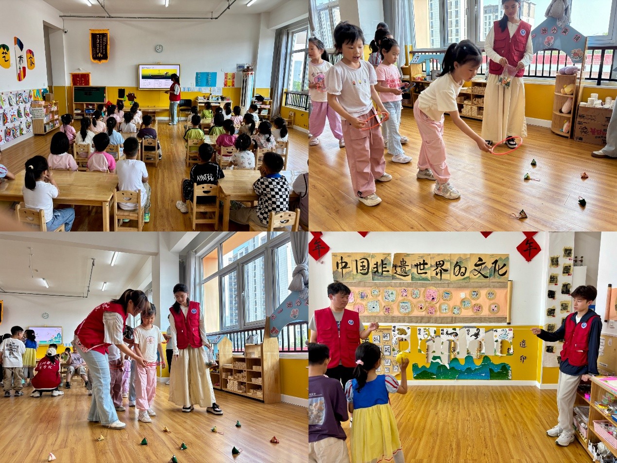 志愿者以生动的语言和丰富的图片动画,讲述了屈原投江、龙舟竞渡等端午节故事,孩子们仿佛穿越千年,置身于古人挂艾草、佩香囊的节日场景中。随后的互动环节中,“投五毒”游戏通过沙包投掷“蝎子、蛇、蜈蚣、壁虎、蟾蜍”卡片,让孩子们了解驱邪避害的传统智慧;而“套粽子”环节中,小朋友们手持彩环套取粽子造型的香包,在欢笑中传递端午习俗的趣味与深意。