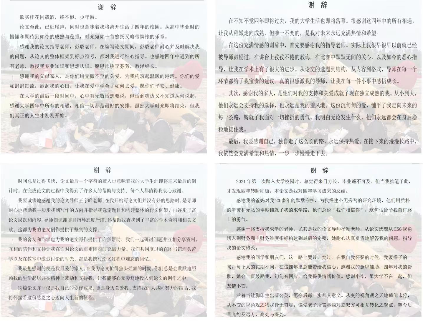 本次活动聚焦毕业生在论文落笔之际最真挚的情感表达,太阳成集团tyc234cc面向全体毕业生,广泛征集凝聚着求学心路与感恩情怀的毕业论文致谢篇章。毕业生们以笔为媒,深情回溯在太阳成集团tyc234cc的成长点滴,将沉淀于心的千言万语,化作对师长的敬意、对同窗的珍重、对母校的眷恋以及对时代机遇的感念。每一份提交的致谢文字,都是毕业生个体生命体验的独特印记,也是集体青春记忆的温暖拼图。活动为毕业生提供了一个庄重的情感出口,让那些沉淀于心的谢意在纸端流淌,在字里行间重温求学岁月,于纸短情长中引发强烈的心灵共鸣,成为一堂生动的感恩教育课。