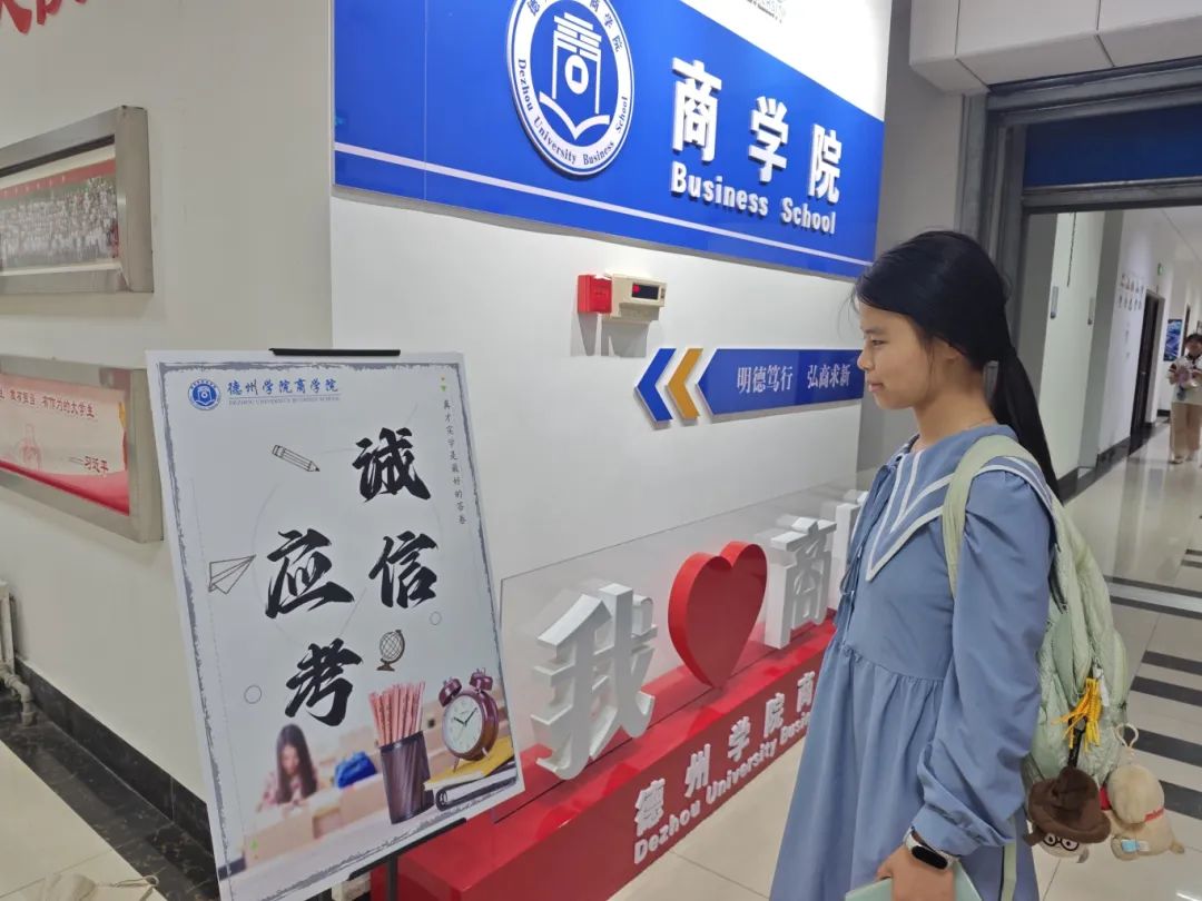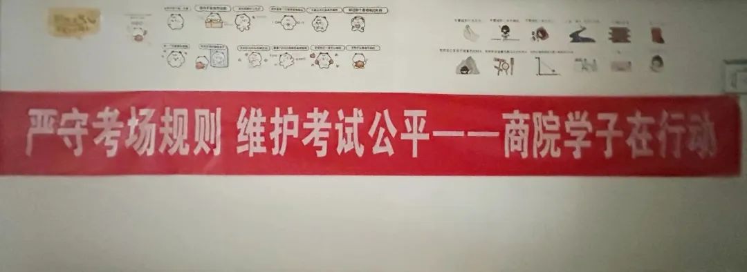 太阳成集团tyc234cc在公司走廊、员工活动区域等醒目位置悬挂了“严守考场规则 维护考试公平——商院学子在行动”等主题鲜明、警示性强的宣传条幅,营造出浓厚的诚信考试氛围。同时,精心制作了诚信教育小展板,陈列于教学楼大厅等处,成为员工驻足学习、自我警醒的“流动课堂”。